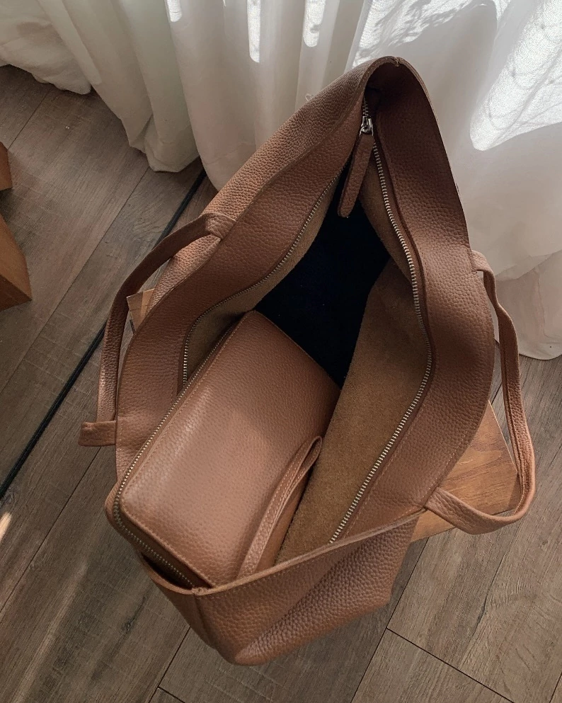 Tote de cuero vacuno con cierre de primera calidad.